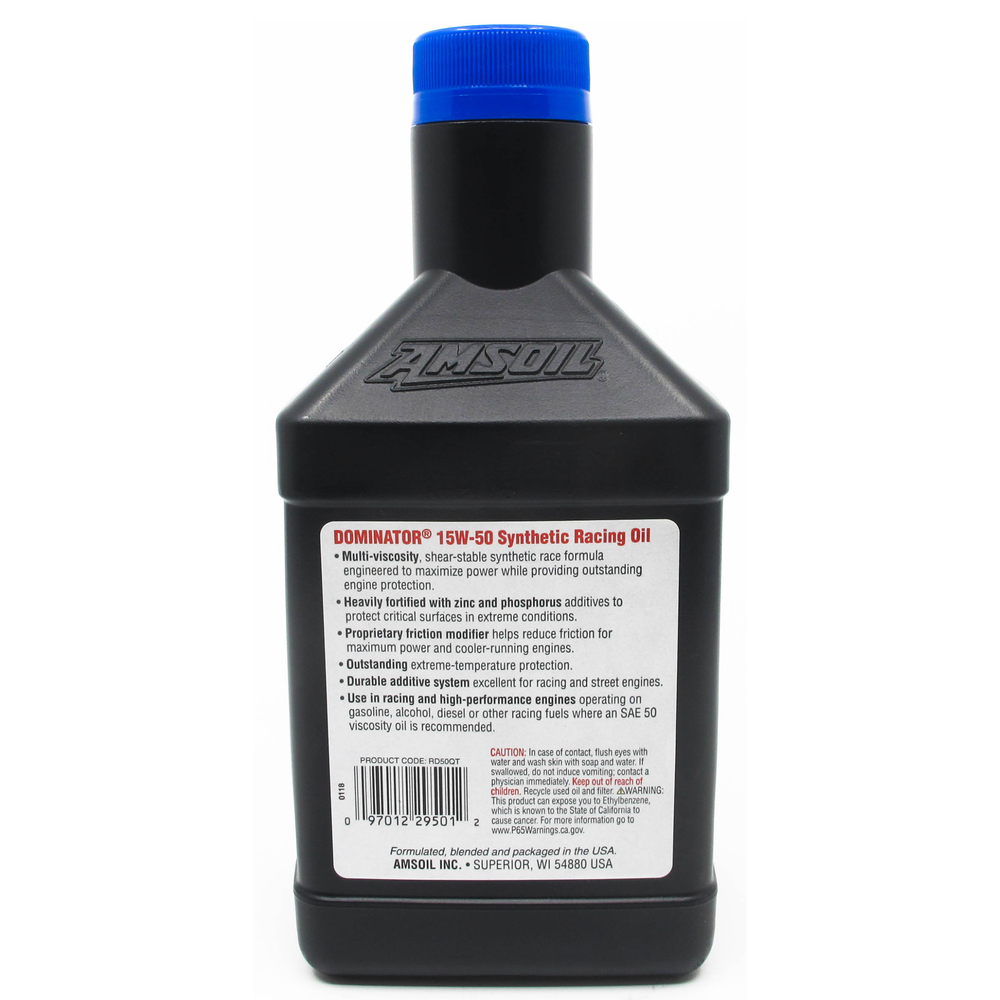 AMSOIL DOMINATOR 15W-50 is a fully synthetic racing engine oil engineered to help maximize power while delivering outstanding protection in extreme heat, high rpm, and shock-load conditions. Its shear-stable formulation helps maintain a strong protective oil film, and it’s heavily fortified with zinc and phosphorus anti-wear additives for added protection in severe racing environments.